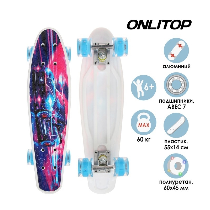Пенниборд предназначен для катания по городским улицам. Подходит для детей от 6 лет.Колёса изготовлены из полиуретана, что повышает стойкость к коррозии и износу, имеют высокие показатели грузоподъёмности и их невозможно проколоть. Материал деки изготовлен из пластика — это повышает уровень долговечности и устойчивости к влаге, поэтому пенниборд подходит для регулярной езды в любых погодных условиях. Во время движения колёса светятся.Подшипник ABEC 7 подходит опытными райдерами, обладают высокой точностью вращения и влагозащитой.