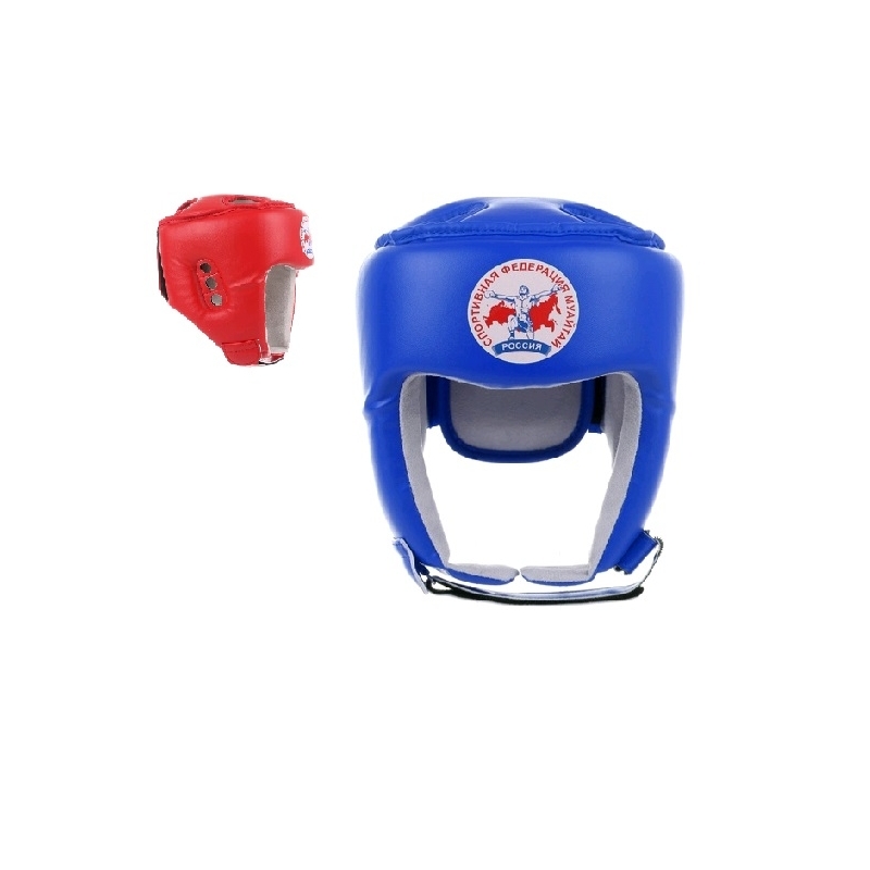 Шлем турнирный для тайского бокса Разработан при содействии федерации тайского бокса России (ФТБР). Конструкция шлема обеспечивает отличную обзорность. Верхняя часть головы защищена от ударов локтями накладкой, толщиной 120мм. Дугообразная форма лобной части шлема надежно прикрывает брови от рассечений. В подбородочной зоне имеются подушки, предназначенные для защиты от натирания подбородочным ремнем. Внутренний вкладыш имеет два слоя полимерной пены, что обеспечивает хорошую защиту головы спортсмена. Общая толщина шлема 280мм, в то же время он достаточно легкий, не более 350гр. Шлем имеет большой диапазон регулировок по размеру, благодаря широкой застежке на затылке. Два типоразмера позволяют охватить максимальный размерный ряд. M – от 52 до 56, L – от 56 до 60