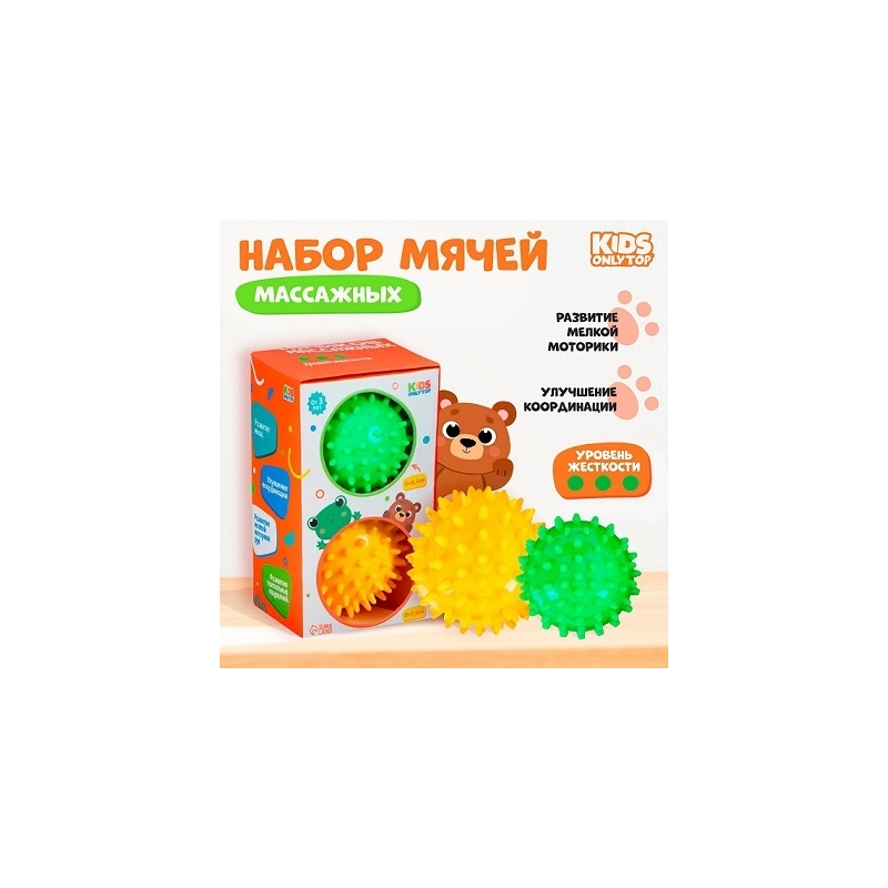 Набор массажных мячей предназначен для физического воздействия на биологически-активные точки на теле. Применяется с целью общего оздоровления организма, укрепления иммунитета, расслабления, снятия физического и психоэмоционального перенапряжения.Массажёр развивает моторику рук ребёнка, способствует улучшению памяти, внимания и развитию речи.Диаметр: 6.5 см, 7.5 см.
