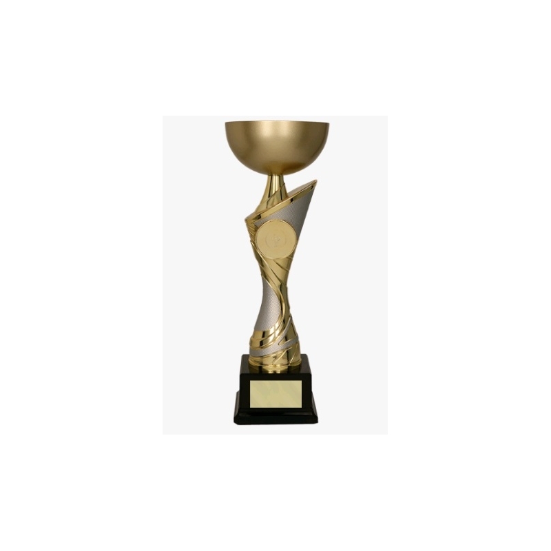 Современная золотая чашка с серебряными мотивами. Металлический кубок без украшения, подчеркивающий спортивный характер приза.Возможность размещения вкладышей в центральной точке.Из-за сужения центральной части вала идеальная чашка помещается в руку.● Высота чашки: 25 см. ● Диаметр чашки: 10 см. ● Цвет: золото-серебро. ● Материал: металл, пластик