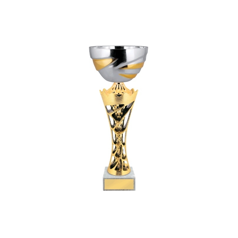 Кубок с металлической чашей на основании из мрамора.Можно укомплектовать крышкой, дополненной фигурой или держателем под вкладыш на выбор (не входит в стоимость).Высота, 31.5 см.Диам. чаши, 14 см Крышка KR1-140,KR2-140 Основание МраморЦвет Золото, Серебро Ручки НетМатериал чаши Металл