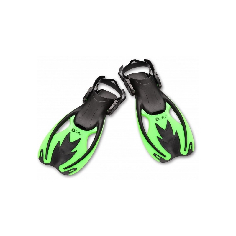 Ласты INDIGO TORPEDO детские с открытой пяткой для подводного плавания, снорклинга, дайвинга и начинающих охотников. Калоши из эластичной резины и удобные ремешки регулировки позволяют использовать аксессуар нескольким ныряльщикам с разными размерами ноги. Двухкомпонентный состав лопасти обеспечивает отличные характеристики гребка и манёврености.