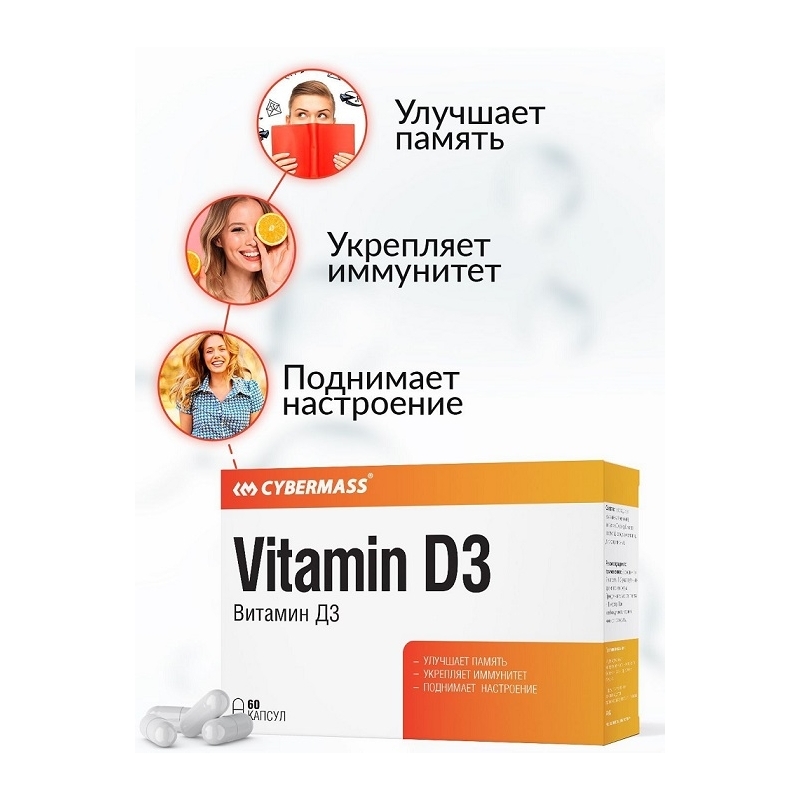 Витамин Д3 (холекальциферол) - незаменимый витамин для многих метаболических процессов.Холекальциферол помогает регулировать усвоение кальция и фосфора, влияя на метаболизм костной ткани, способствуя укреплению и улучшению состояния костей и зубов, снижает риск развития остеопороза.Витамин D3 способен стимулировать иммунную систему, снижая риск возникновения, тяжесть и длительность течения вирусных респираторных инфекций, а также хронических воспалений.Витамин D3 поддерживает репродуктивную функцию мужчин и женщин. У женщин адекватный уровень витамина необходим для поддержания функционирования яичников, зачатия и развития беременности. У мужчин обеспеченность витамином D3 ассоциирована с количеством сперматозоидов, их подвижностью.Важной функцией витамина D3 также является контроль над синтезом серотонина - гормона, ответственного за ощущение счастья и хорошего настроения. Достаточный уровень витамина D3 является одним из значимых факторов, сдерживающих развитие депрессивных расстройств.Витамин D3 способствует улучшению памяти, концентрации внимания и эффективной работе мозга в целом.Витамин D3 участвует в обмене веществ, в частности, глюкозы и жиров. Дефицит этого витамина увеличивает риск развития ожирения.Витамин Д3 для поддержки иммунитета, здоровья мышц, строения костей, хорошего сна, развития памяти и красоты. Регулирует обмен и уровень содержания кальция и фосфора в организме, предотвращает развитие остеопороза, повышает иммунитет, снижая восприимчивость организма к инфекциям, улучшает настроение, наполняя организм серотонином "гормоном счастья" на целый день.