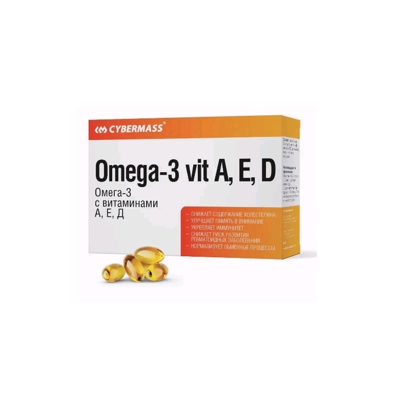 Омега-3 с витаминами А, Е, Д уменьшает риск сердечно-сосудистых заболеваний, способствует нормализации артериального давления, улучшает память, внимание, мыслительные функции, способствует снижению уровня «плохого» холестерина в крови (ЛПНП), участвует в формировании нервной системы и органа зрения у детей, активизирует иммунитет, уменьшает интенсивность воспалительных процессов. Улучшает состояние репродуктивной системы мужчин и женщин, нормализует обменные процессы у лиц с избыточным весом, влияет на внешний вид кожи, способствует увлажнению кожи, разглаживанию морщин, способствует сохранению тонуса, энергии, молодости, торможению процессов старения. Докозагексаеновая кислота входит в состав серого вещества головного мозга, глазной сетчатки, оболочек клеток других органов и систем, играет первостепенную роль в формировании головного мозга и нервной системы человека, влияет на скорость передачи нервного импульса. Эйкозапентаеновая кислота стимулирует регенерацию клеточных мембран, нормализует механизмы транспорта липидов по кровяному руслу, активизирует иммунитет, улучшает абсорбцию жиров в пищеварительном тракте, повышает антиоксидантные функции организма. Витамин А способствует улучшению зрения и укреплению иммунитета. Витамин D необходим для поддержания иммунной системы, роста и укрепления костей и зубов и нервной ткани. Витамин E необходим всем тканям организма, так как помогает клеткам «дышать» и обладает «косметическими» свойствами — разглаживает морщины, питает кожу, оказывает общеукрепляющее и антиоксидантное действие.