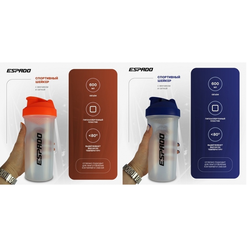 Шейкер спортивный Espado с венчиком и сеткой, 600 мл, ES904, произведена из гипоаллергенного пластика, отлично подойдет для спортсменов. Шейкер Espado оснащен широкой крышкой на резьбе, что облегчает наполнение, металлическим венчиком и сеткой. Отлично подойдет для смешивания жидкости и порошка (приготовления коктейлей и смесей) благодаря наличию венчика и сетки данный процесс проходит быстрее и не оставит комков. Яркие и сочные расцветки шейкеров Espado заряжают энергией, на поверхность нанесен фирменный логотип и мерная шкала. Подходит для напитков с температурой до 80 градусов. Шейкер прочный и легкий. Прекрасно подойдет и взрослым, и детям. Удобна в использовании: на тренировке, прогулке или на работе. Востребованный аксессуар для спортсмена на каждый день.