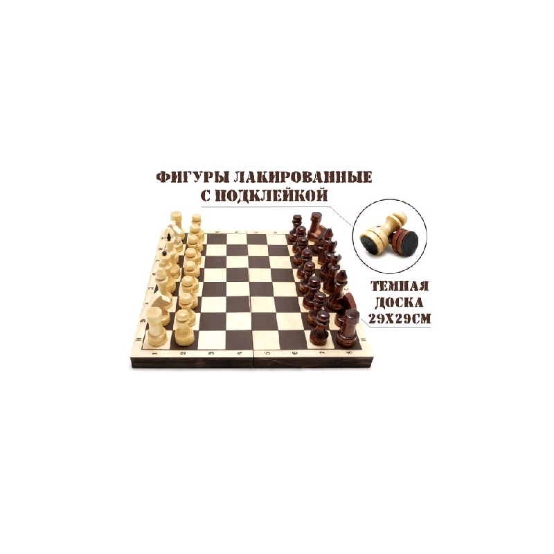 Доска: корпус пиломатериалы хвойных или лиственных пород, крышка - фанера березовая.Покрытие доски – лак.Размер доски (мм): длина 290±4,05, ширина 145±3,15, высота 38±1,95.Размер квадрата шахматного поля (мм) 33±1,95.Фигуры изготовлены из пиломатериалов лиственных пород.Покрытие фигур – лак.Подклейка фигур - винил-кожзамРазмер фигур (мм):Король: Ø основания 24±1,65, высота 72±2,30Ферзь: Ø основания 24±1,65, высота 60±2,30Слон: Ø основания 24±1,65, высота 59±2,30Ладья: Ø основания 24±1,65, высота 46±1,95Конь: Ø основания 24±1,65, высота 50±1,95Пешка: Ø основания 24±1,65, высота 44±1,95