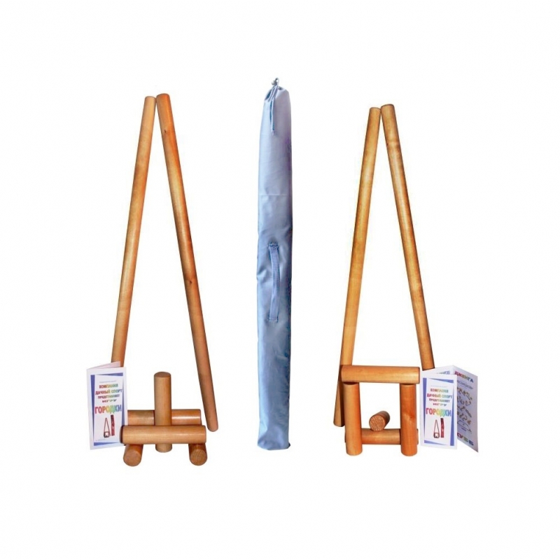 Городки комплектуются двумя берёзовыми битами длиной 90 см, конусообразной формы с диаметром основания 35 мм и диаметром вершины биты 30 мм. Пятью берёзовыми городками (чушками) длиной 20 см диаметром 45 мм. Биты и городки покрыты бесцветным лаком.Набор упакован в удобную сумку с наплечным ремнем. Горловина сумки затягивается шнурком