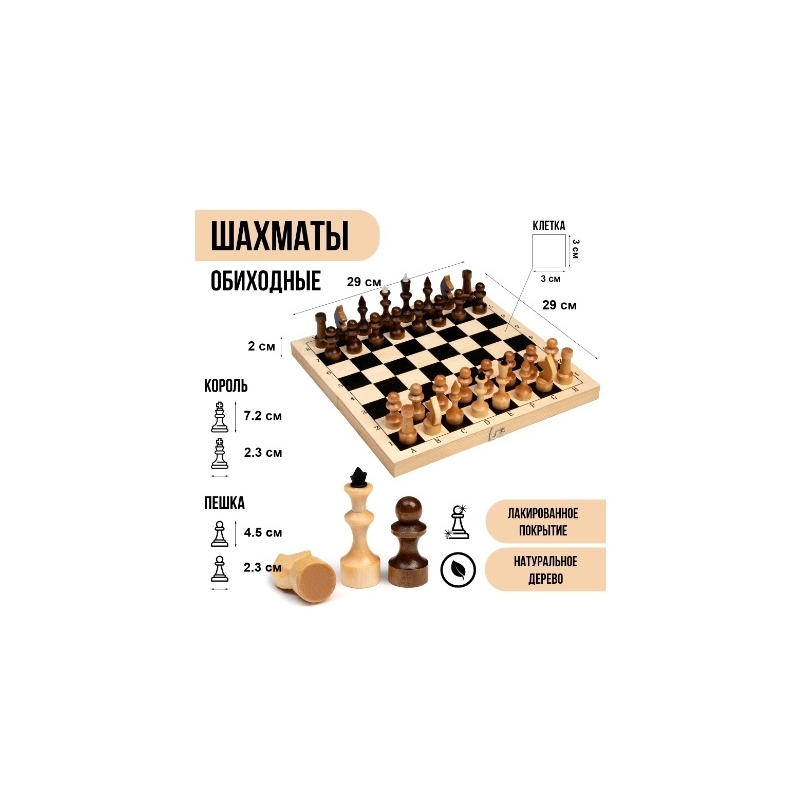 Шахматы – это настольная игра, в которую могут играть как дети, так и взрослые, они могут быть использованы в качестве развивающей игрушки для детей, а для взрослых они могут стать увлекательным хобби. Обиходные шахматы способствуют развитию фантазии и концентрации внимания, учат стратегически мыслить и тренируют усидчивость.Шахматная деревянная лакированная доска из качественных пиломатериалов: каркас выполнен из сосны, поле - берёзовая фанера. Размер доски в разложенном виде 29 х 29 см. Доска имеет аккуратную и надежную фурнитуру и вместительный отсек для хранения.Фигуры приятно и удобно держать в руке. Они выполнены из высококачественного экологически чистого дерева, покрыты лаком, что обеспечивает привлекательный внешний вид и длительный срок службы.Такой набор подойдёт для школьников, студентов, в кружках и секциях, для турниров и соревнований.Играть в интеллектуальные игры можно где угодно: дома, в школе, в компании, с друзьями, родителями, детьми.ДополнительноВысота короля 7.2 см, диаметр основания 2.3 смВысота пешки 4.5 см, диаметр основания 2.3 смВысота ферзя 6.2 см, диаметр основания 2.3 смВысота ладьи 4.6 см, диаметр основания 2.3 смВысота коня 5 см, диаметр основания 2.3 смВысота слона 6 см, диаметр основания 2.3 смДоска: 29 х 29 смКлетка 3 х 3 смВысота доски в разложенном виде 2 смКомплектациядоска из дерева - 1 штфигуры из дерева - 32 шт