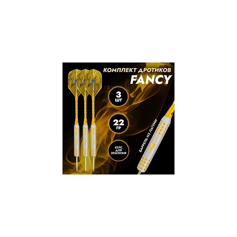 Дротики являются важнейшим элементом для игры в дартс, от их особенностей напрямую зависит уровень и качество игры. Комплект дротиков для игры в дартс среднего уровня из игровой серии FANCY. Комплект состоит из 3 дротиков весом 22 гр, баррель которых изготовлен из латуни. Латунные дротики являются общедоступным инструментом как для любителей, так и для профессионалов. Алюминиевые хвостовики в сочетании с оперением дают жесткую но при этом легкую конструкцию. Стальные иглы легко и устойчиво “входят” в мишень, что обеспечивает более точные и стабильные броски, исключая вероятность отскока. Комплект состоит из 3 баррелей, 3 хвостовиков, 3 оперений и кейса. Разборная конструкция дротиков позволяет заменить его хвостовик и оперение по мере изнашивания оборудования.