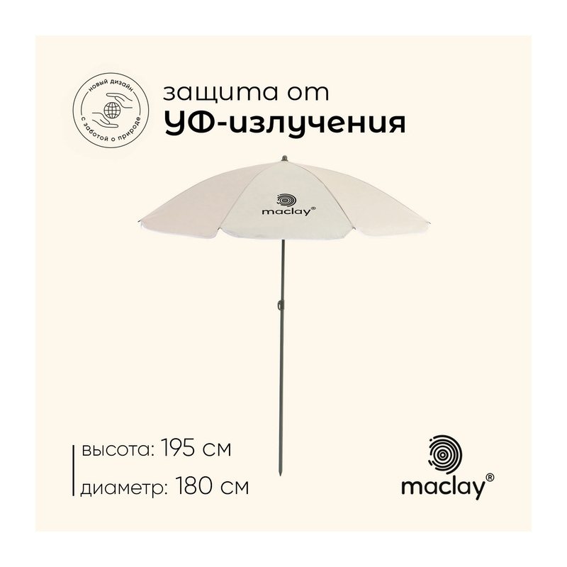 Складной зонт maclay предназначен для комфортного отдыха на открытом воздухе. Изделие защищает от УФ-излучения за счёт тефлонового покрытия с внутренней стороны купола. Материал зонта устойчив к воздействию внешних факторов, что гарантирует долгий срок службы.ПреимуществаКупол выполнен из прочной ткани с тефлоновым покрытием от УФ-излучения.Зонт усилен 8 стальными спицами, что обеспечивает устойчивость к порывам ветра и другим внешним воздействиям.ПараметрыДиаметр купола: 180 см.Материал купола: нейлон 210D.Диаметр спиц: 2 мм.Диаметр верхней трубы: 19 мм.Диаметр нижней трубы: 22 мм.Высота зонта: 195 см.Материал стержня и спиц: сталь.